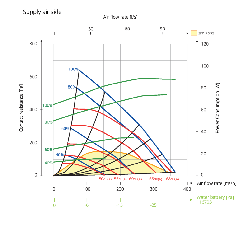 Dane dźwiękowe są określone jako poziom mocy akustycznej LWA na wykresach wydajności. Wartości te można skorygować za pomocą tabeli dla różnych pasm oktawowych w celu uzyskania LW. Tabela korekcji dla różnych oktaw jest podana w LW, co oznacza, że wartości LW są po przeliczeniu każdej oktawy dla powietrza nawiewanego i wywiewanego.