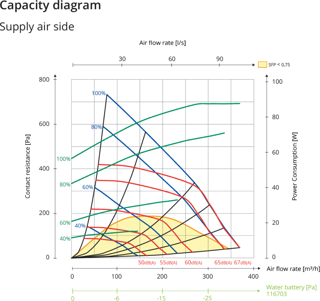 Dane dźwiękowe są określone jako poziom mocy akustycznej LWA na wykresach wydajności. Wartości te można skorygować za pomocą tabeli dla różnych pasm oktawowych w celu uzyskania LW. Tabela korekcji dla różnych oktaw jest podana w LW, co oznacza, że wartości LW są po przeliczeniu każdej oktawy dla powietrza nawiewanego i wywiewanego.