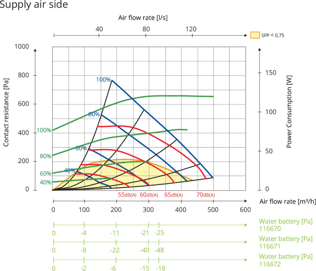 Dane dźwiękowe są określone jako poziom mocy akustycznej LWA na wykresach wydajności. Wartości te można skorygować za pomocą tabeli dla różnych pasm oktawowych w celu uzyskania LW. Tabela korekcji dla różnych oktaw jest podana w LW, co oznacza, że wartości LW są po przeliczeniu każdej oktawy dla powietrza nawiewanego i wywiewanego.