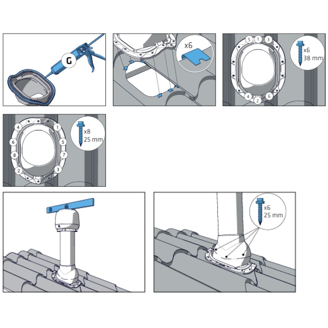 Zestaw zawiera przejście dachowe, uszczelkę, wkręty, silikon oraz instrukcję montażu wraz z szablonem.